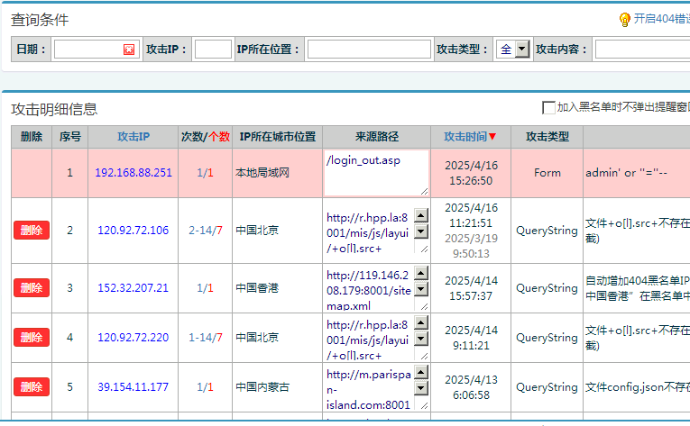 ![]() 你現(xiàn)在出現(xiàn)這個(gè)問題,是因?yàn)槟銓Ⅻc(diǎn)晴OA服務(wù)器放在了防火墻之后,導(dǎo)致所有外網(wǎng)訪問都需要通過這個(gè)防火墻過濾后才到OA服務(wù)器,所以點(diǎn)晴OA服務(wù)器沒法直接拿到外部訪問者的IP,只能拿到你們防火墻的IP,但你們的防火墻并沒有檢測(cè)到攻擊者的SQL注入攻擊行為。 根據(jù)上面這個(gè)截圖,點(diǎn)晴OA系統(tǒng)檢測(cè)到了來自于192.168.88.251的黑客SQL注入攻擊行為,所以將這個(gè)IP拉入了Windows系統(tǒng)防火墻黑名單,由于所有人都是通過這個(gè)IP中轉(zhuǎn)訪問點(diǎn)晴OA系統(tǒng),結(jié)果就是所有外網(wǎng)用戶都無法訪問點(diǎn)晴OA系統(tǒng)了。 如果不對(duì)單位內(nèi)部網(wǎng)絡(luò)做變更的話,由于所有訪問者不管是正常的OA系統(tǒng)訪問用戶、還是攻擊黑客,OA系統(tǒng)抓取到的都是同一個(gè)IP地址,所以為了避免黑客攻擊被攔截導(dǎo)致所有人都無法訪問OA系統(tǒng),就只能關(guān)閉點(diǎn)晴OA系統(tǒng)的這些安全措施,關(guān)閉方法如下: 1、參考以下教程,將IP從黑名單中移除?
