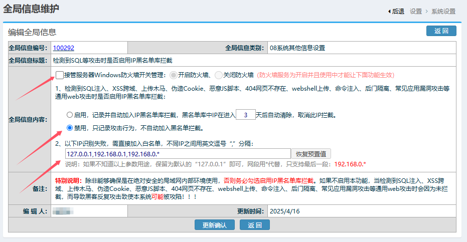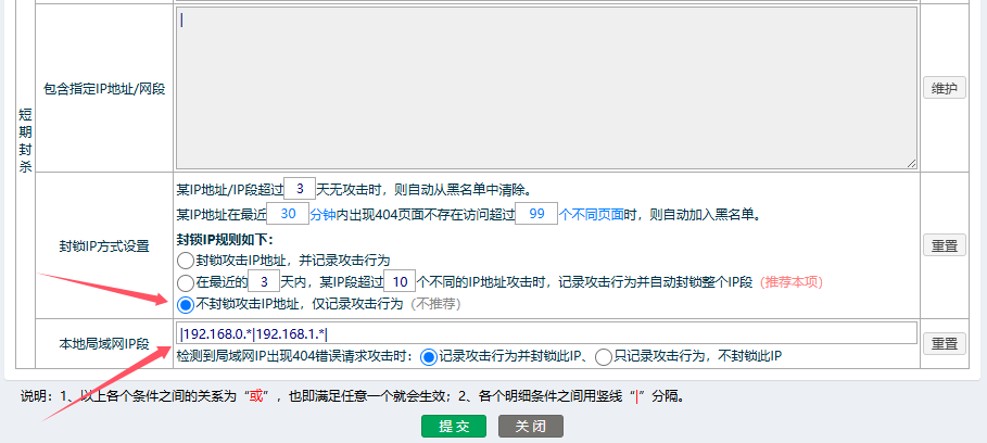 在最下面的“短期封殺”中,也需要將“封鎖IP規(guī)則如下”設(shè)置為:“不封鎖攻擊IP地址,僅記錄攻擊行為”,如果是局域網(wǎng)IP的話,將局域網(wǎng)IP網(wǎng)段也加入進(jìn)去: