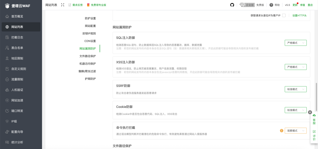 而想要申訴又要準備大量的材料和走復(fù)雜的流程,如果你的網(wǎng)站有很多客戶,那在你網(wǎng)站不能訪問的日子里,你的客戶又會何去何從? 與其事后亡羊補牢,不如事前做好加固防御,通過堡塔云WAF給網(wǎng)站加一層防御,避免因攻擊而造成的損失。 堡塔云WAF是一款真正開源免費可商用的WAF防火墻,首個支持ARM國產(chǎn)系統(tǒng)的WAF防火墻,有超高自由度的自定義攔截規(guī)則和可靈活配置各種限制訪問,有效防CC攻擊、防惡意采集、防刷接口等常見攻擊和黑客滲透測試行為,為您的業(yè)務(wù)網(wǎng)站保駕護航。 1??全面防護 一鍵無憂 支持精準攔截主流Web攻擊,智能識別CC攻擊高頻請求,秒級阻斷SQL注入與XSS跨站腳本;嚴格過濾惡意文件上傳,實時攔截遠程命令執(zhí)行及非法文件包含漏洞,并配備主動防御機制,有效對抗黑客工具掃描。無需復(fù)雜配置,全方位為您的業(yè)務(wù)穿上隱形防護甲。