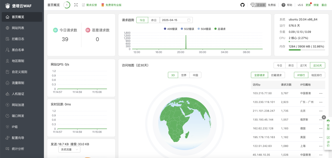 2??離線安裝 此安裝方式適用于服務(wù)器無法連接公網(wǎng)節(jié)點時的選擇,請參照Github獲取更詳細的安裝說明。 堡塔云WAF以攻防可視化為眼、精準攔截為刃、合規(guī)管控為盾,從漏洞封堵到攻擊溯源,從風(fēng)險預(yù)警到一鍵封禁,為您的業(yè)務(wù)構(gòu)建全生命周期防護鏈。無需專業(yè)運維,無需停服升級,點擊開啟安全防護,讓黑客攻擊“撞墻而歸”,您的網(wǎng)站安心跑在「安全快車道」! 立即免費體驗 → 安全,從來就該如此簡單 目前全套代碼已在Github開源,歡迎大家Star,提交Issue&PR