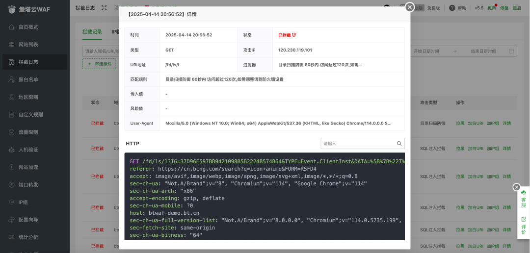2??攻擊攔截全流程可視 堡塔云WAF精準記錄每次攻擊的精確時間、目標網(wǎng)站、受攻擊URL路徑及攻擊類型(如SQL注入/XSS),實時追蹤惡意IP歸屬地(例:北京·阿里云),并自動生成可檢索的攔截日志庫,支持一鍵封禁高危IP或?qū)С龉粼斍?,讓黑客行蹤無所遁形,威脅處置快準穩(wěn)!