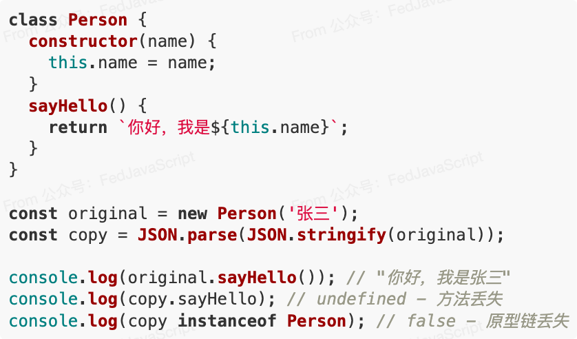 1. 無法處理循環(huán)引用一旦對(duì)象中存在循環(huán)引用,這種方法就會(huì)直接拋出錯(cuò)誤,導(dǎo)致程序崩潰。 2. 丟失特殊數(shù)據(jù)類型