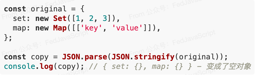 深拷貝后的對(duì)象變成了普通對(duì)象,失去了原型鏈上的所有方法和屬性。 4. Map、Set、WeakMap、WeakSet 的處理