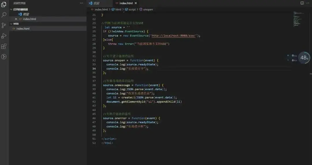 function createLi(data){ let li = document.createElement("li"); li.innerHTML = String(data.message); return li;} let source = '' if (!!window.EventSource) { source = new EventSource('http://localhost:8088/sse/'); }else{ throw new Error("當(dāng)前瀏覽器不支持SSE") }