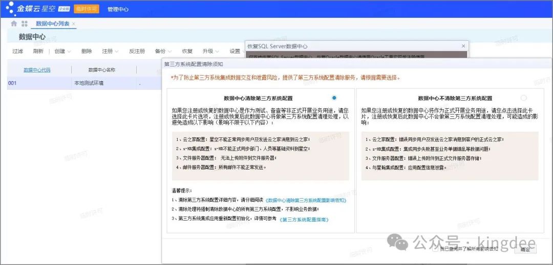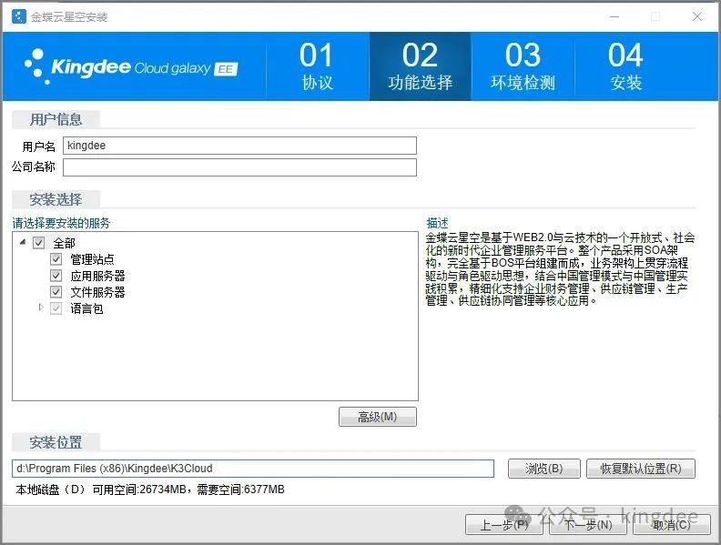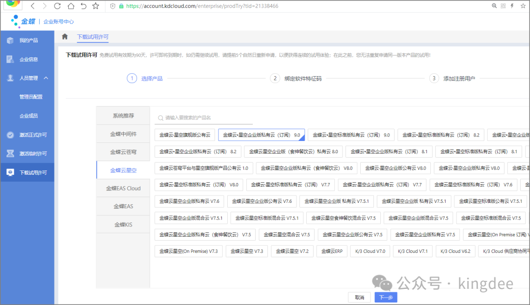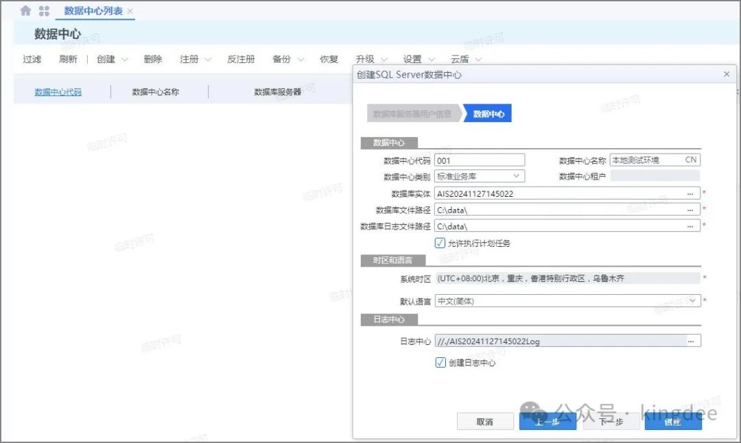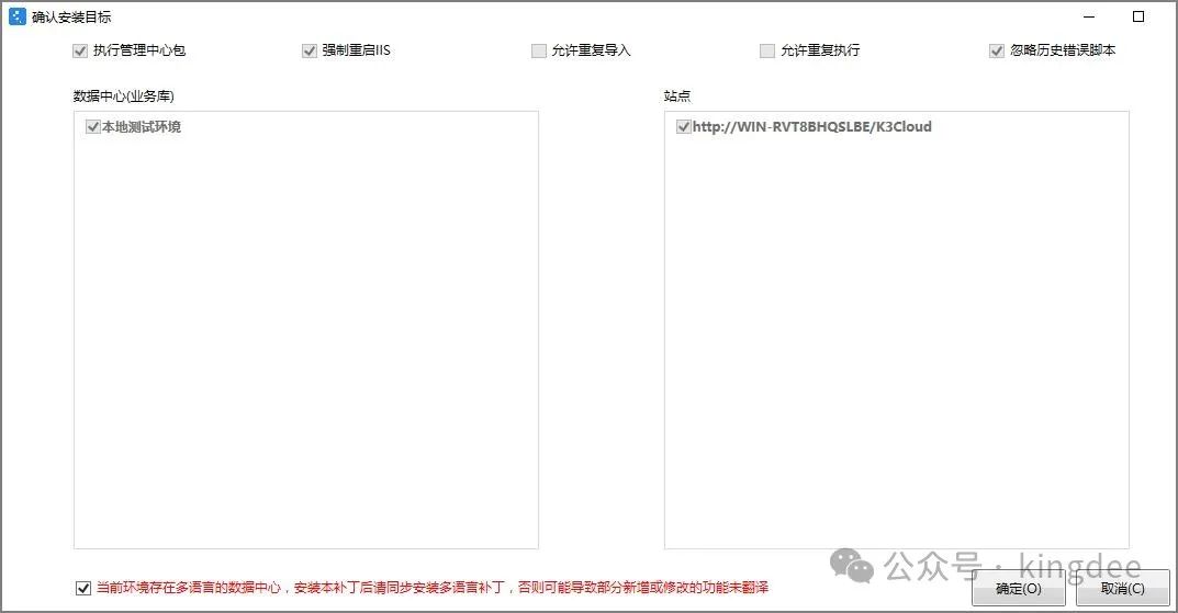 本文以安裝金蝶云星空V9企業(yè)版,并升級(jí)9.0.0.20241121版本為例,描述整個(gè)金蝶云星空測(cè)試環(huán)境的搭建過程,方便客戶更加快速準(zhǔn)確的搭建測(cè)試環(huán)境。 主要應(yīng)用場(chǎng)景為: 1、 金蝶云星空公有云環(huán)境搭建線下測(cè)試環(huán)境; 2、 補(bǔ)丁升級(jí)前,先搭建金蝶云星空測(cè)試環(huán)境測(cè)試升級(jí); 3、 開發(fā)、對(duì)接等測(cè)試需求下的金蝶云星空測(cè)試環(huán)境搭建。 2.金蝶云星空測(cè)試環(huán)境搭建過程2.1 下載金蝶云星空V9安裝包1、 DVD包下載路徑 點(diǎn)擊產(chǎn)品介紹說明,進(jìn)入產(chǎn)品詳細(xì)介紹頁(yè)面,點(diǎn)擊【下載安裝包】進(jìn)行安裝包下載。 2.2金蝶云星空安裝部署環(huán)境要求本文以硬件環(huán)境6C,32G,1TSSD,系統(tǒng)環(huán)境為windows server2016,sql server2012為例編寫(操作系統(tǒng)和數(shù)據(jù)庫(kù)安裝不在本文檔描述范圍,需要IT工程師先行部署)。硬件的推薦配置可以參考金蝶云星空DVD安裝包下,help文件夾中的產(chǎn)品安裝指南,獲取當(dāng)前版本支持的操作系統(tǒng)和數(shù)據(jù)庫(kù)版本信息。 2.3金蝶云星空安裝部署環(huán)境準(zhǔn)備1、服務(wù)器管理器中安裝IIS 和 .net4.8(V9版本之前.net4.5即可)、消息隊(duì)列。 1. IIS中除了FTP服務(wù)器之外,其他的功能建議都展開勾選安裝。 2. 自帶的.net4.x版本全部勾選安裝。 3. 在下方勾選消息隊(duì)列安裝。 4. 在安裝包中找到安裝包K3Cloud_DVD_9.0_ENT\OS_Default\vcredist_x64安裝vc_redist.x64.exe(如果操作系統(tǒng)自身不帶.net4.8,還需要在安裝包K3Cloud_DVD_9.0_ENT\OS_Default\DOTNETFX48中找到ndp48-x86-x64-allos-enu.exe進(jìn)行安裝)。 2.4金蝶云星空產(chǎn)品安裝1、運(yùn)行setup.exe安裝程序,進(jìn)入到安裝歡迎界面,點(diǎn)擊“開始”,進(jìn)入下一步安裝步驟。 2、錄入公司名稱,選擇安裝位置(可以自定義路徑,不要安裝在中文路徑下)。 3、下一步之后,會(huì)進(jìn)行環(huán)境檢測(cè),因?yàn)樵谥耙呀?jīng)安裝好必要的環(huán)境依賴,所以檢測(cè)基本可以通過,下圖中的2個(gè)可以忽略(安全軟件最好在安裝過程中退出,可能出現(xiàn)誤攔截的情況)。 4、點(diǎn)擊下一步,正式開始安裝。 5、安裝完成。 6、創(chuàng)建管理中心。 數(shù)據(jù)庫(kù)服務(wù)器:數(shù)據(jù)庫(kù)服務(wù)器的ip或者機(jī)器名。 數(shù)據(jù)庫(kù)管理員用戶:能連接數(shù)據(jù)庫(kù)服務(wù)器的管理賬號(hào)和密碼,一般為sa。 數(shù)據(jù)庫(kù)連接用戶:能連接數(shù)據(jù)庫(kù)服務(wù)器的一般賬號(hào)和密碼,可以同數(shù)據(jù)庫(kù)管理員用戶。 數(shù)據(jù)庫(kù)實(shí)體:系統(tǒng)自動(dòng)生成,該實(shí)體為管理數(shù)據(jù)庫(kù)的數(shù)據(jù)庫(kù)實(shí)體。 數(shù)據(jù)庫(kù)文件路徑:數(shù)據(jù)庫(kù)實(shí)體存放的本地路徑,點(diǎn)擊搜索按鈕會(huì)彈出數(shù)據(jù)庫(kù)服務(wù)器的文件路徑,根據(jù)自己的需要進(jìn)行設(shè)置。 數(shù)據(jù)庫(kù)日志文件路徑:日志庫(kù)存放的路徑,默認(rèn)設(shè)置成和數(shù)據(jù)庫(kù)文件路徑相同。 7、登錄管理中心并創(chuàng)建數(shù)據(jù)中心。 管理庫(kù)創(chuàng)建完成后,登錄管理中心,管理中心登錄賬號(hào)密碼默認(rèn)為:Administrator\888888。 進(jìn)入【數(shù)據(jù)中心列表】可進(jìn)行業(yè)務(wù)數(shù)據(jù)中心創(chuàng)建和維護(hù)(創(chuàng)建、刪除、注冊(cè)、反注冊(cè)、備份、恢復(fù)等)。 輸入數(shù)據(jù)庫(kù)服務(wù)器ip或者機(jī)器名,數(shù)據(jù)庫(kù)管理員賬號(hào),數(shù)據(jù)庫(kù)連接用戶(可以同管理數(shù)據(jù)中心創(chuàng)建),下一步輸入數(shù)據(jù)中心名稱,選擇數(shù)據(jù)庫(kù)實(shí)體存放路徑,進(jìn)行業(yè)務(wù)數(shù)據(jù)中心的創(chuàng)建。 2.5更新標(biāo)準(zhǔn)產(chǎn)品補(bǔ)丁2、補(bǔ)丁安裝依賴K3cloudManager服務(wù)(環(huán)境安裝完成后,該服務(wù)會(huì)自動(dòng)生成),檢查服務(wù)器是否正常啟動(dòng)。 3、 在管理中心服務(wù)器打開補(bǔ)丁包安裝文件。 4、 輸入管理中心登錄密碼,點(diǎn)擊確定。 5、 在彈出的確認(rèn)安裝框再次點(diǎn)擊確定開始安裝,等待安裝完成(補(bǔ)丁安裝過程,用戶無(wú)法正常使用星空系統(tǒng))。 到這里,星空標(biāo)準(zhǔn)功能已經(jīng)安裝完成并升級(jí)到了目前最新的9.0.0.20241121版本。 如果有二開功能部署,建議咨詢二開工程師,是否部署補(bǔ)丁或者直接拷貝對(duì)應(yīng)的二開dll文件到website\bin目錄。 3. 恢復(fù)數(shù)據(jù)中心備份3、如何恢復(fù)數(shù)據(jù)中心的截圖如下: 等待恢復(fù)完成之后,登陸客戶端或者瀏覽器選擇對(duì)應(yīng)的數(shù)據(jù)中心訪問。 4 申請(qǐng)臨時(shí)許可并引入在云平臺(tái)申請(qǐng)臨時(shí)許可,但僅限3個(gè)用戶,單次申請(qǐng)有效期3個(gè)月,申請(qǐng)時(shí)企業(yè)需要是已認(rèn)證狀態(tài)。 超過3哥用戶的臨時(shí)許可申請(qǐng),請(qǐng)聯(lián)系當(dāng)?shù)亟鸬こ處焻f(xié)助。 獲取3個(gè)用戶的臨時(shí)許可申請(qǐng)如下步驟: 2、 點(diǎn)【下載試用許可】。 3、 選擇和安裝產(chǎn)品符合的許可(不能選擇公有云)。 4、 輸入軟件特征碼。特征碼可以從管理中心的軟
