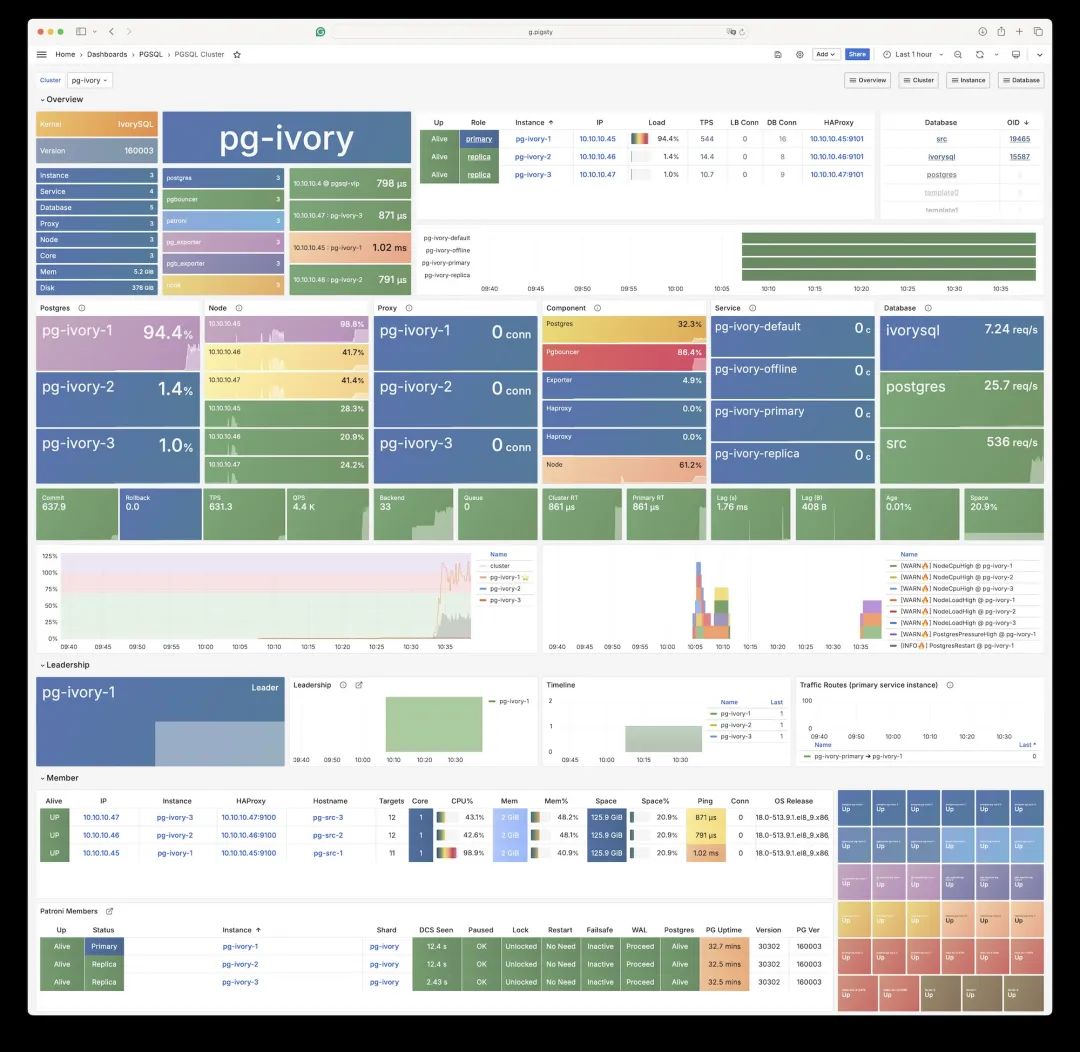 目前 IvorySQL 最新版本4.4與 PostgreSQL 最新小版本 17.4 保持兼容,并且提供了主流 Linux 上的二進(jìn)制 RPM/DEB 包。 而 Pigsty 提供了在 PG RDS 中將原生 PostgreSQL 替換為 IvorySQL 內(nèi)核的選項(xiàng)。 快速上手使用標(biāo)準(zhǔn)流程安裝Pigsty,并使用 啊是的,就是這么簡單,只要使用 IvorySQL 配置模板替代默認(rèn)的配置模板,你就可以拉起 “Oracle” 兼容的 PG RDS 了。 對(duì)于生產(chǎn)環(huán)境部署,您應(yīng)當(dāng)在執(zhí)行