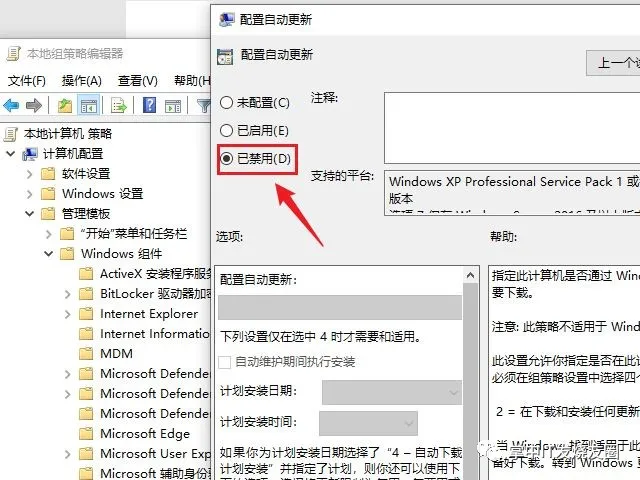 只有WindowsUpdate任務(wù)可以以管理員身份禁用,其它兩個內(nèi)置管理員也沒有權(quán)限操作,使用第三方軟件NSudo提權(quán)到TrustedInstaller運行C:\Windows\System32\taskschd.msc后成功禁用這三個服務(wù)下的所有任務(wù),再禁用三個服務(wù)項,時間調(diào)整至一個月后,三個服務(wù)項和它們的計劃程序都被系統(tǒng)恢復啟用,自動更新功能正常使用,又失敗了。 還可以在“本地組策略編輯器”-計算機配置-管理模板-windows組件-windows更新下,找到“配置自動更新”并禁用,實測也無法禁止自動更新。