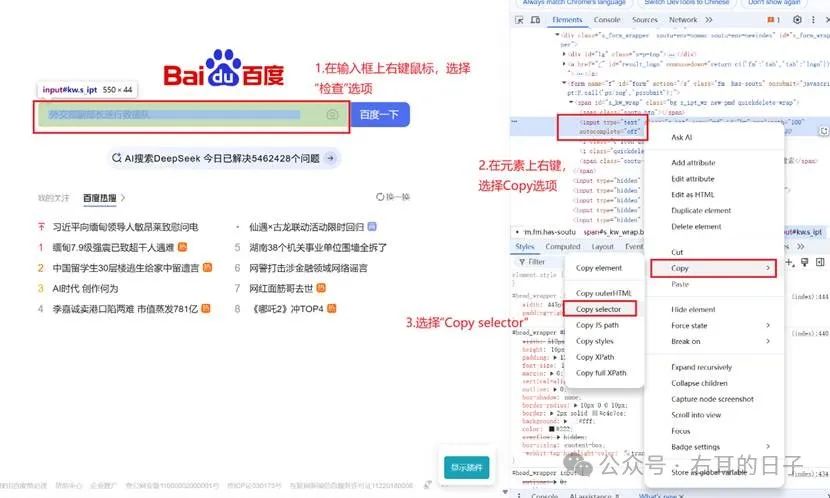 操作步驟 (1)添加數(shù)據(jù): 方法一:將Excel數(shù)據(jù)文檔,直接拖動(dòng)到頁(yè)面上方虛線部分區(qū)域,頁(yè)面會(huì)自動(dòng)完成加載Excel文檔。 方法二:點(diǎn)擊頁(yè)面上方虛線部分區(qū)域的【選擇文檔】按鈕,在彈窗中選擇要加載的Excel文檔。 方法三:Crtl+C直接復(fù)制Excel文檔中的數(shù)據(jù),Ctrl+V直接粘貼到文檔數(shù)據(jù)區(qū)域。 (2)數(shù)據(jù)確認(rèn)完畢后,點(diǎn)擊【完成數(shù)據(jù)添加,加載至自動(dòng)化腳本】按鈕,則數(shù)據(jù)會(huì)加載至插件。 5.2編排腳本 可以將執(zhí)行腳本Excel文件。? ![]() 操作步驟 (1)添加腳本: 與添加數(shù)據(jù)方法一致,可以拖動(dòng)、選擇或復(fù)制Excel數(shù)據(jù)到流程區(qū)。 (2)下載模板:可以下載模板,按照模板,編寫自己的頁(yè)面操作腳本。 注意事項(xiàng) 一行數(shù)據(jù)即為一次操作,請(qǐng)保持第一行為英文標(biāo)識(shí),按照下列規(guī)則編寫操作流程: A列:orderNo,序號(hào) B列:desc,描述 C列:selector,頁(yè)面元素的選擇器 D列:action,操作方式,input填充、click點(diǎn)擊、mousedown鼠標(biāo)下壓等 E列:value,需要填充的或點(diǎn)擊的值,結(jié)合【數(shù)據(jù)加載】使用,如果需要填充或點(diǎn)擊【數(shù)據(jù)加載】中的某一列,則填寫列編號(hào) F列:delayTm,操作延遲執(zhí)行時(shí)間,默認(rèn)為0,若有些操作需要等待頁(yè)面加載完成后執(zhí)行,則可以填預(yù)估的時(shí)間,如2,則延遲2秒執(zhí)行 G列:loopFlag,循環(huán)標(biāo)志位,兩行之間標(biāo)志位相同,則中間的操作會(huì)循環(huán)執(zhí)行 H列:loopCount,循環(huán)次數(shù),表示標(biāo)志位中間的操作需要循環(huán)的次數(shù) I列:condition,執(zhí)行條件,表示該條流程執(zhí)行的條件,默認(rèn)正常執(zhí)行 6. 流程編排方法 6.1填寫selector字段 方法一:簡(jiǎn)單填寫法。復(fù)制瀏覽器的selector,在粘貼到Excel文檔的selector字段里去 注意事項(xiàng): 該方法適合元素相對(duì)固定的頁(yè)面。動(dòng)態(tài)加載的可能會(huì)有影響。