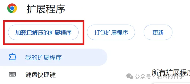 (4)打開后,頁(yè)面左邊,選擇“加載已解壓的擴(kuò)展程序”,找到剛剛解壓好的瀏覽器插件目錄,并點(diǎn)擊確定。
