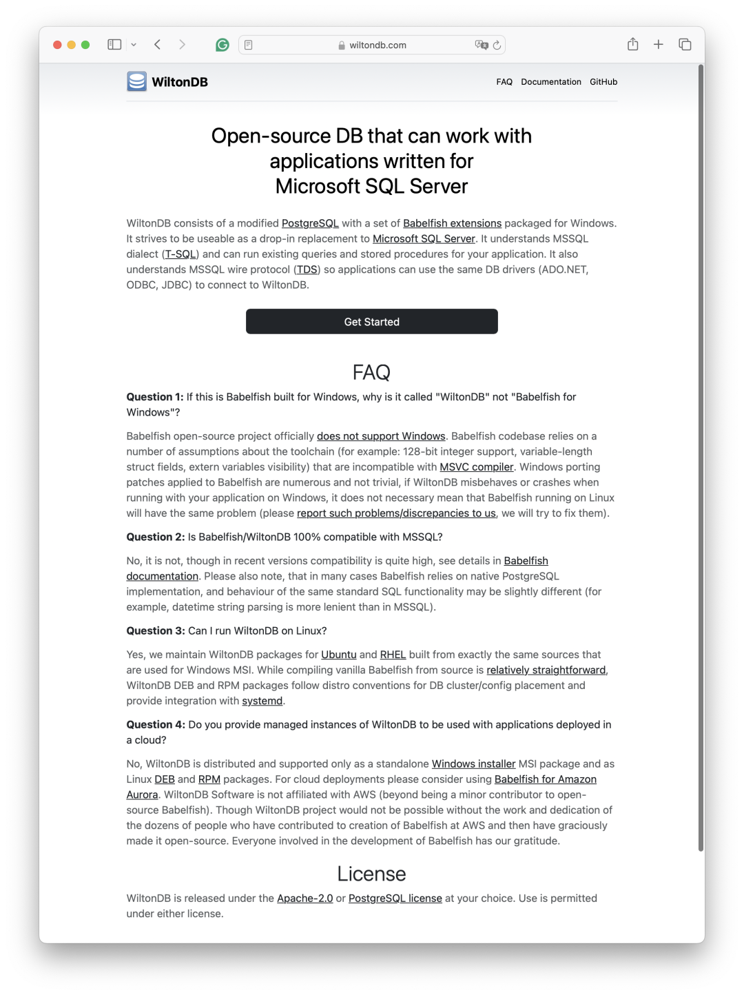 所謂線纜協(xié)議兼容,就是指客戶端什么都不用改,依然訪問 SQL Server 1433 端口,使用 MSSQL 的驅(qū)動(dòng)與命令行工具(sqlcmd)訪問加裝 BabelfishPG 的集群就可以了。而且更神奇的是,你依然可以使用 PostgreSQL 的協(xié)議語言語法,從原來的 5432 端口訪問,和 SQL Server 的客戶端并存 —— 這就給遷移帶來了極大的便利條件。 WiltonDB當(dāng)然 Babelfish 并不是一個(gè)單純的 PG 擴(kuò)展插件,它對(duì) PostgreSQL 內(nèi)核進(jìn)行了少量修改與適配。并通過四個(gè)擴(kuò)展插件分別提供了 TSQL 語法支持,TDS 線纜協(xié)議支持,數(shù)據(jù)類型以及其他函數(shù)支持。