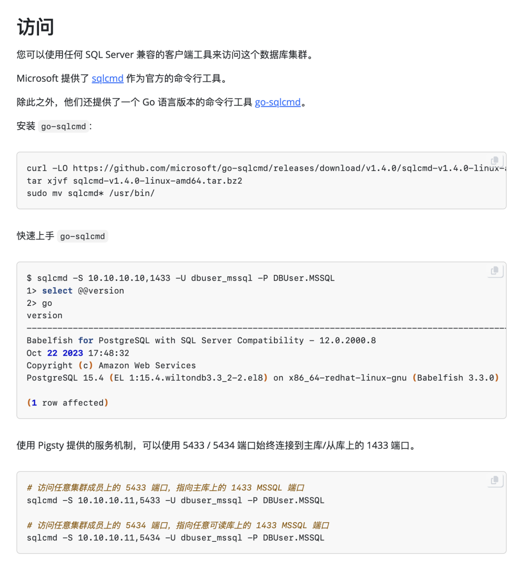 在使用實(shí)踐上,你完全可以把 Babelfish 集群當(dāng)作一套普通的 PostgreSQL 集群來使用與管理。唯一的區(qū)別就是客戶端在使用 5432 PGSQL 協(xié)議的基礎(chǔ)上,還可以選擇是否要使用 1433 端口上的 TSQL 協(xié)議支持。