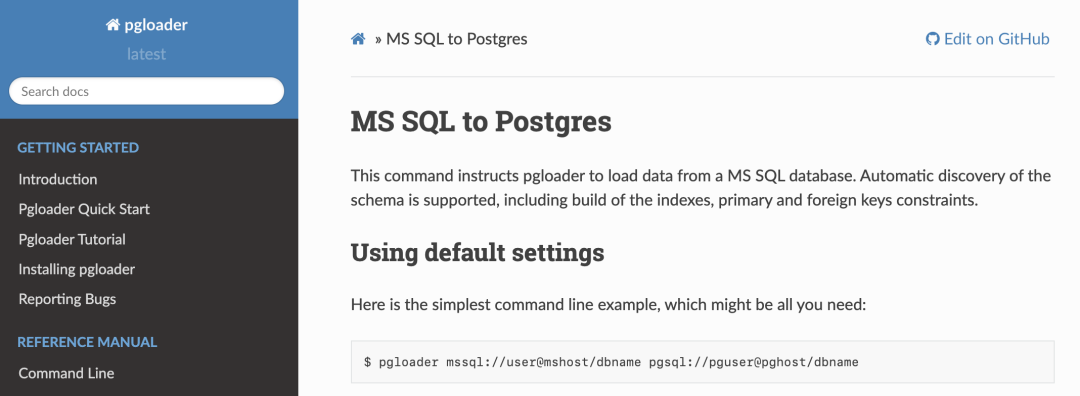 這意味著原本屬于 PostgreSQL RDS 的能力 —— 高可用,時(shí)間點(diǎn)恢復(fù),監(jiān)控系統(tǒng),IaC管控,SOP預(yù)案,甚至無數(shù)的擴(kuò)展插件都可以嫁接融合到 SQL Server 版本的內(nèi)核之上。 怎么遷移過去?PostgreSQL 生態(tài)除了有Babelfish這樣給力的內(nèi)核與擴(kuò)展,還有著繁榮的工具生態(tài)。如果要想從 SQL Server 或 MySQL 遷移到 PostgreSQL ,我強(qiáng)烈推薦一款殺手級(jí)遷移工具:PGLOADER。 這款遷移工具傻瓜化到了離譜的程度,在理想的情況下,你只需要兩個(gè)數(shù)據(jù)庫的連接串,就可以完成遷移了。對(duì),真的是一行多余的廢話都沒有。