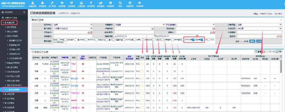 如果需要知道銷售訂單中物料的生產(chǎn)進(jìn)度和詳細(xì)送貨時(shí)間等,進(jìn)入ERP系統(tǒng)-》銷售管理-》訂貨單信息跟蹤,勾選“生產(chǎn)訂單”和“送貨單”,可以看到相應(yīng)產(chǎn)品的生產(chǎn)進(jìn)度和送貨進(jìn)度以及時(shí)間等: