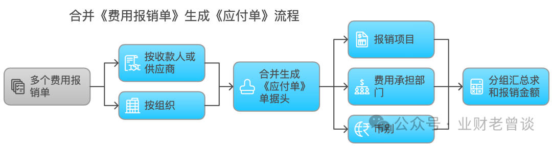 比如多個(gè)《費(fèi)用報(bào)銷單》,按同一【收款人 or 供應(yīng)商】、【組織】合并生成1個(gè)《應(yīng)付單》單據(jù)頭,再用【報(bào)銷項(xiàng)目(即轉(zhuǎn)換后的費(fèi)用類型】、【費(fèi)用承擔(dān)部門】、【幣別】作匯總,匯總求和字段為【報(bào)銷金額(價(jià)稅合計(jì))】;