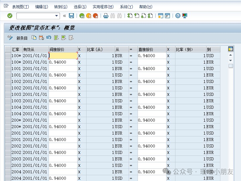 匯率的改動 事務(wù)碼:OB08 查看系統(tǒng)貨幣匯率的具體內(nèi)容如下圖所示: