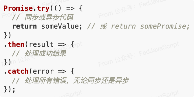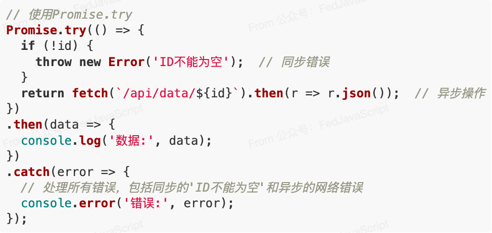 這種混合處理方式既冗長又容易出錯,特別是在代碼邏輯較復(fù)雜的情況下。 Promise.try的出現(xiàn)為了解決上述問題,Promise.try作為一種新的錯誤處理方案應(yīng)運(yùn)而生。雖然Promise.try目前還不是ECMAScript的標(biāo)準(zhǔn)功能,但已經(jīng)在許多庫(如Bluebird)中實(shí)現(xiàn),并有望在未來版本的JavaScript中被標(biāo)準(zhǔn)化。 Promise.try的基本概念Promise.try接受一個函數(shù)作為參數(shù),無論該函數(shù)返回同步值還是Promise,都會將其"提升"為Promise。這意味著所有錯誤(無論是同步還是異步)都可以通過統(tǒng)一的Promise錯誤處理機(jī)制來捕獲。
