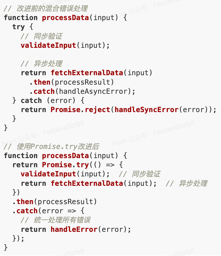 Promise.try的優(yōu)勢1. 統(tǒng)一的錯誤處理機(jī)制最大的優(yōu)勢是統(tǒng)一了同步和異步錯誤的處理方式,不再需要混合使用try-catch和Promise.catch: