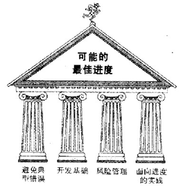 圖 2.1-1 快速開發(fā)的四跟支柱 典型錯誤:是指一些經(jīng)常被許多人使用的無效的開發(fā)實踐,如:不現(xiàn)實的預(yù)期,缺乏計劃,功能蔓延和銀彈綜合癥等。將在第3章詳細講解。 開發(fā)基礎(chǔ):是指項目開發(fā)過程中管理、技術(shù)、質(zhì)量保證等方面行為和活動,如:計劃編制,需求管理和技術(shù)回顧等。將在第4章詳細講解。 風(fēng)險管理:是指對有可能影響項目的風(fēng)險進行評估和控制。將在第5章討論進度計劃相關(guān)的風(fēng)險。 面向進度的實踐有以下三類: