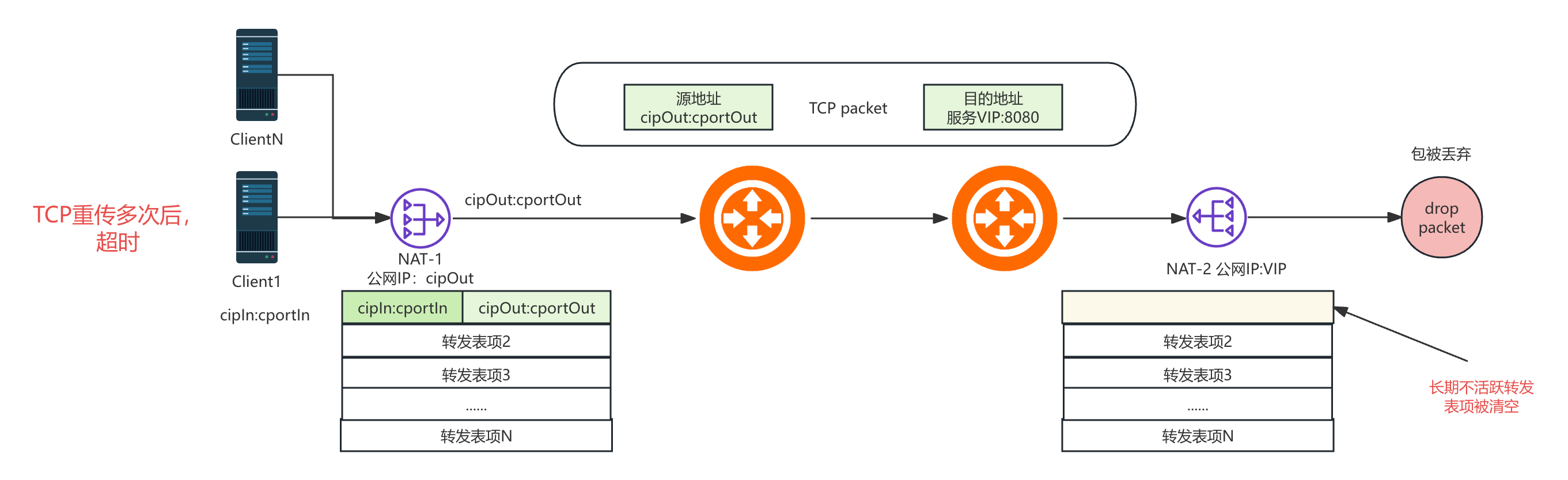 很明顯的,由于client和server的數(shù)量是非常多的(因?yàn)槎鄠€(gè)服務(wù)可能公用一個(gè)公網(wǎng)IP),所以轉(zhuǎn)發(fā)表是一個(gè)非常寶貴的資源,一旦轉(zhuǎn)發(fā)表滿了,就無法創(chuàng)建新的連接路徑了。所以,一些長(zhǎng)期沒有流量需要有一個(gè)定時(shí)的清理機(jī)制騰出轉(zhuǎn)發(fā)表以供新的連接創(chuàng)建。如下圖所示,在tcp連接estalbish狀態(tài)后一定時(shí)間內(nèi)沒有任何流量,NAT會(huì)直接清空這個(gè)轉(zhuǎn)發(fā)表項(xiàng),而client和server端無法感知到這一點(diǎn),于是client端只好在多次NAT重傳后超時(shí)。這個(gè)和Bug現(xiàn)場(chǎng)的各種特征完全一致。當(dāng)然無論是NAT-1和NAT-2都有可能清理轉(zhuǎn)發(fā)表,只要有一個(gè)過期那么這個(gè)連接就會(huì)出現(xiàn)超時(shí)。