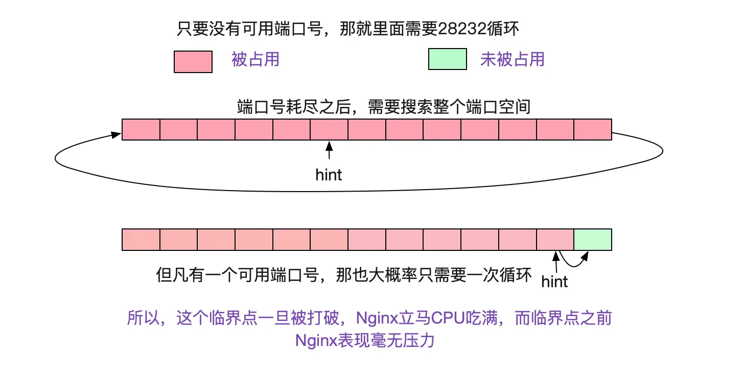 使用LVS做NAT的默認(rèn)超時(shí)時(shí)間那么我們看一下我們最常用的使用LVS做NAT的默認(rèn)超時(shí)時(shí)間是多少,讓我們來番一下LVS源代碼: 從上面代碼中我們可以看到,LVS通過設(shè)置的timeout_table來設(shè)置轉(zhuǎn)發(fā)表項(xiàng)超時(shí)時(shí)間,而不同的tcp狀態(tài)會(huì)有不同的超時(shí)時(shí)間,而默認(rèn)的established的超時(shí)時(shí)間是15 * 60 * HZ也就是15min。也就是說,在默認(rèn)不設(shè)置的情況下,15min中之后這個(gè)連接就會(huì)GG。 解決方案好了,了解完原理之后,我們就可以有解決方案了。第一種方案,就是使用短連接。也就是每次請(qǐng)求的時(shí)候新建一個(gè)連接,NAT本身對(duì)tcp的FIN包做了處理,一旦發(fā)生四次揮手會(huì)自動(dòng)清理表項(xiàng)。用完即回收,即減少了NAT設(shè)備轉(zhuǎn)發(fā)表的壓力也不會(huì)產(chǎn)生過一段時(shí)間超時(shí)的問題。但這個(gè)方案有個(gè)缺陷,也是短連接的固有缺陷。由于復(fù)用不了連接,短時(shí)候有海量的請(qǐng)求過來產(chǎn)生大量的短連接,由于TCP 2MSL機(jī)制的存在,client即有可能出現(xiàn)端口耗盡。而端口耗盡后會(huì)導(dǎo)致Kernel在搜索可用端口號(hào)的時(shí)候性能急劇劣化(每次搜索端口從數(shù)次循環(huán)急劇劣化到每次搜多端口都要數(shù)萬次循環(huán)),這會(huì)導(dǎo)致client端的機(jī)器CPU利用率急劇上升,一直陷在搜索端口號(hào)的循環(huán)里面導(dǎo)致整體不可用! 如下圖所示: