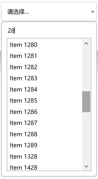 1 /// <summary> 2 /// 下拉項 3 /// </summary> 4 public class ComboItem 5 { 6 /// <summary> 7 /// 實際存儲值 8 /// </summary> 9 public string? ItemValue { get; set; } 10 /// <summary> 11 /// 顯示文本 12 /// </summary> 13 public string? ItemText { get; set; } 14 } 15 16 /// <summary> 17 /// 懶加載下拉數(shù)據(jù)源提供器 18 /// </summary> 19 public class ComboItemProvider : ILazyDataProvider<ComboItem> 20 { 21 private readonly List<ComboItem> _all; 22 public ComboItemProvider() 23 { 24 _all = Enumerable.Range(1, 1000000) 25 .Select(i => new ComboItem { ItemValue = i.ToString(), ItemText = $"Item {i}" }) 26 .ToList(); 27 } 28 public async Task<PageResult<ComboItem>> FetchAsync(string filter, int pageIndex, int pageSize) 29 { 30 await Task.Delay(100); 31 var q = _all.AsQueryable(); 32 if (!string.IsNullOrEmpty(filter)) 33 q = q.Where(x => x.ItemText.Contains(filter, StringComparison.OrdinalIgnoreCase)); 34 var page = q.Skip(pageIndex * pageSize).Take(pageSize).ToList(); 35 bool has = q.Count() > (pageIndex + 1) * pageSize; 36 return new PageResult<ComboItem> { Items = page, HasMore = has }; 37 } 38 } 39 40 /// <summary> 41 /// 封裝獲取數(shù)據(jù)的接口 42 /// </summary> 43 /// <typeparam name="T"></typeparam> 44 public interface ILazyDataProvider<T> 45 { 46 Task<PageResult<T>> FetchAsync(string filter, int pageIndex, int pageSize); 47 } 48 49 /// <summary> 50 /// 懶加載下拉分頁對象 51 /// </summary> 52 /// <typeparam name="T"></typeparam> 53 public class PageResult<T> 54 { 55 public IReadOnlyList<T> Items { get; set; } 56 public bool HasMore { get; set; } 57 } 二、懶加載控件視圖和數(shù)據(jù)邏輯