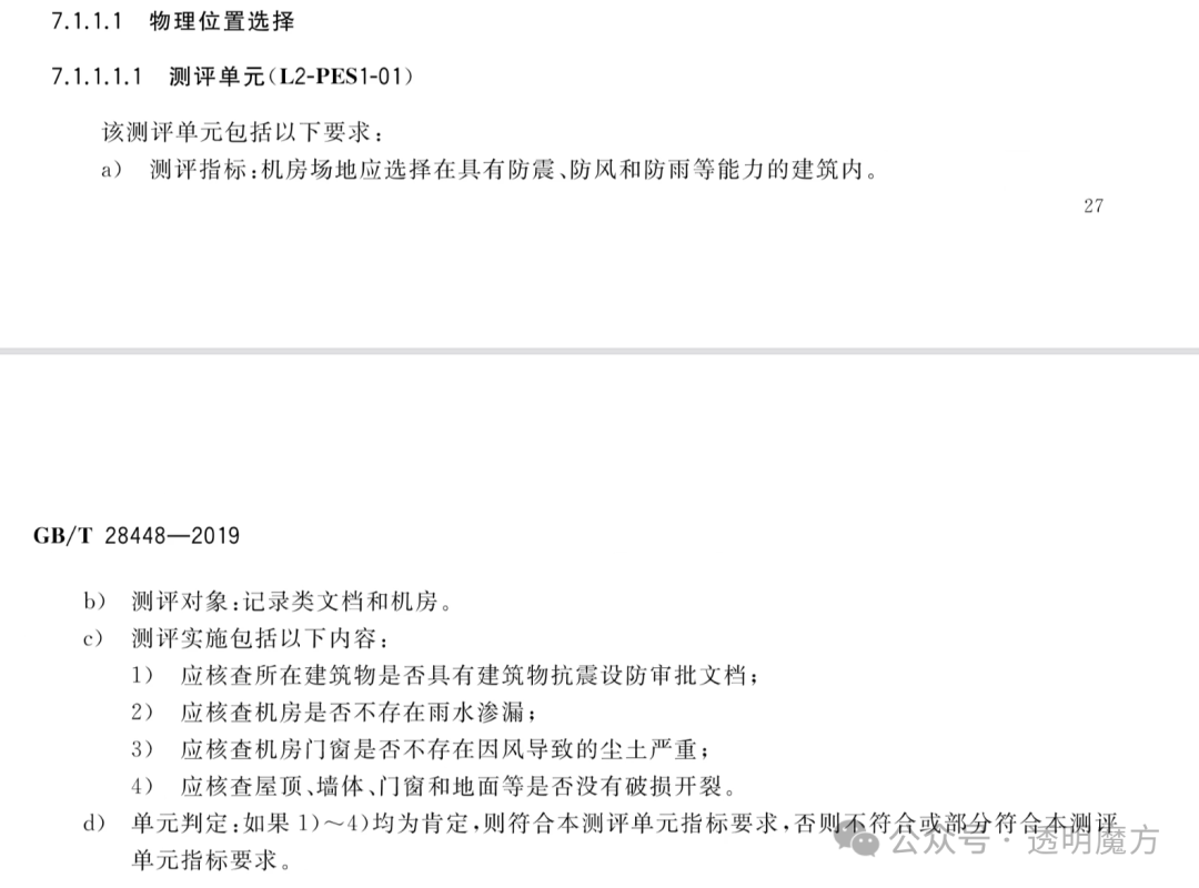 今天陪3位測(cè)評(píng)師到客戶現(xiàn)場(chǎng)進(jìn)行等保測(cè)評(píng)。這家客戶是一個(gè)重點(diǎn)高中,機(jī)房在一幢新建的大樓里。負(fù)責(zé)測(cè)機(jī)房的測(cè)評(píng)師是組長(zhǎng),雖然經(jīng)驗(yàn)豐富,比其他兩位看著資歷老,其實(shí)也還是一個(gè)年輕人。他首先問(wèn)客戶的就是,機(jī)房是在幾樓,得知是在中間樓層后,他就預(yù)判機(jī)房可以防水防潮,以防止因水害導(dǎo)致的設(shè)備損壞。我查了一下,判斷依據(jù)應(yīng)該是GB/T 28448-2019的L2-PES1-02