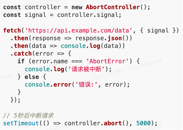 這使得處理各種類型的響應(yīng)變得非常靈活。 中斷請求通過 AbortController,fetch API 支持中斷正在進行的請求: