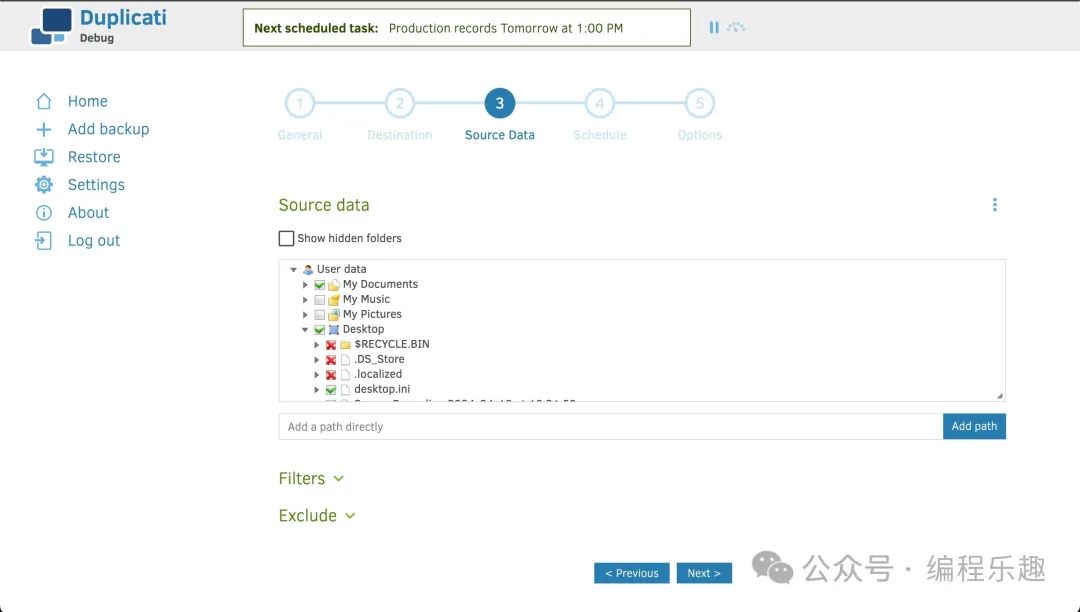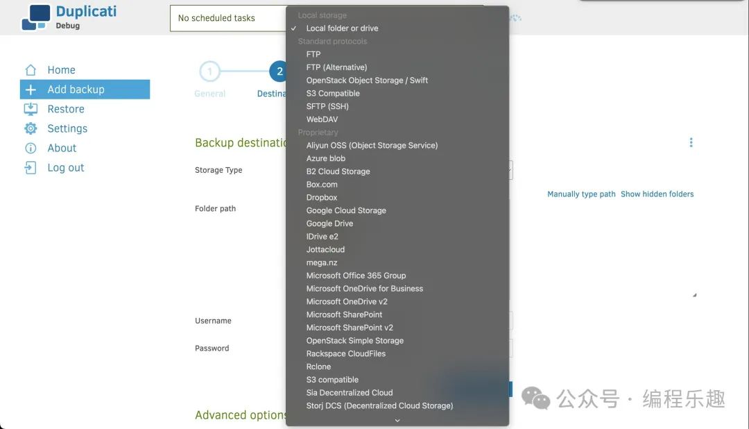 Duplicati 是一個跨平臺的免費、開源的備份客戶端,可以安全地將加密、增量、壓縮的備份存儲在云存儲服務和遠程文件服務器上。支持的云存儲服務:亞馬遜 S3、IDrive e2、Backblaze (B2)、Box、Dropbox、FTP、Google Cloud 和 Drive、MEGA、Microsoft Azure 和 OneDrive、Rackspace Cloud Files、OpenStack Storage (Swift)、Sia、Storj DCS、SSH (SFTP)、WebDAV、阿里云對象存儲(OSS)、騰訊云對象存儲 (COS)。