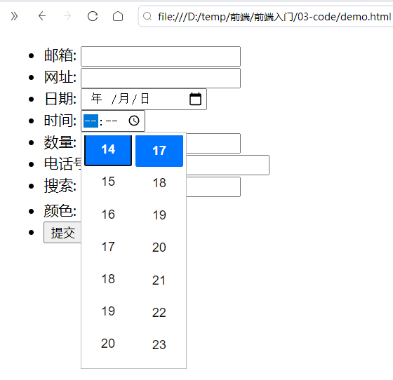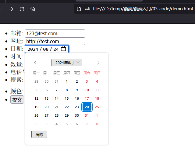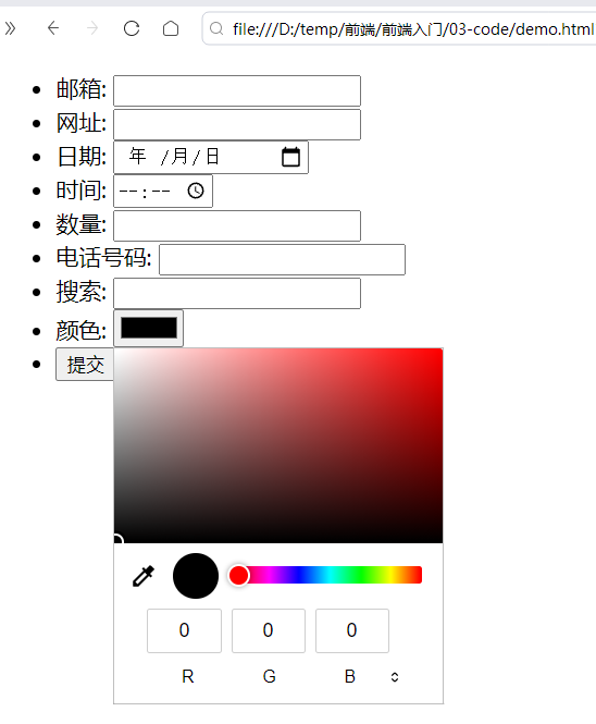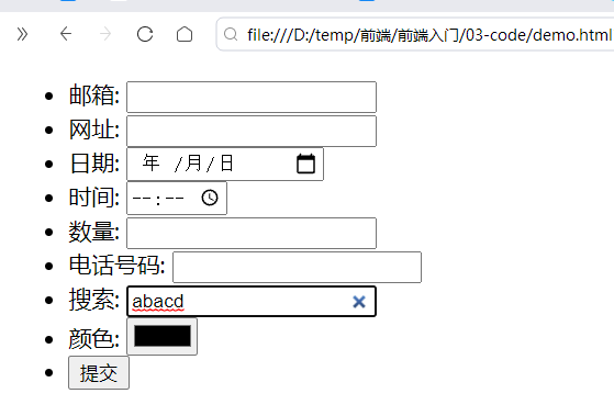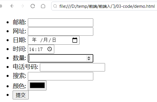 以下 input 類型是 HTML5 中的新類型:color、date、datetime、datetime-local、month、week、time、email、number、range、search、tel 和 url。