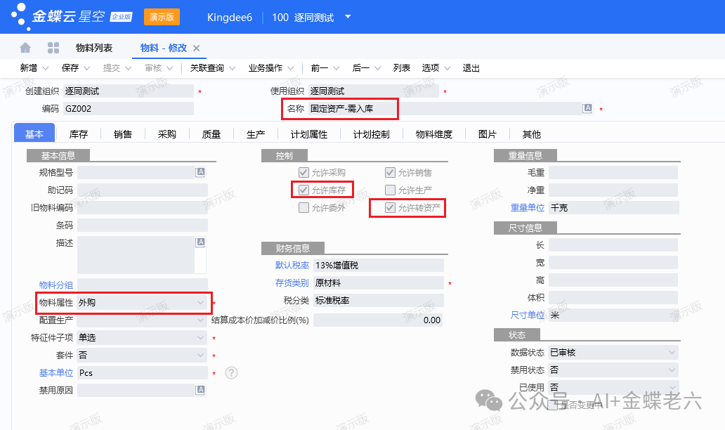 物料屬性:需為"外購(gòu)"且勾選"允許資產(chǎn)",如下圖所示