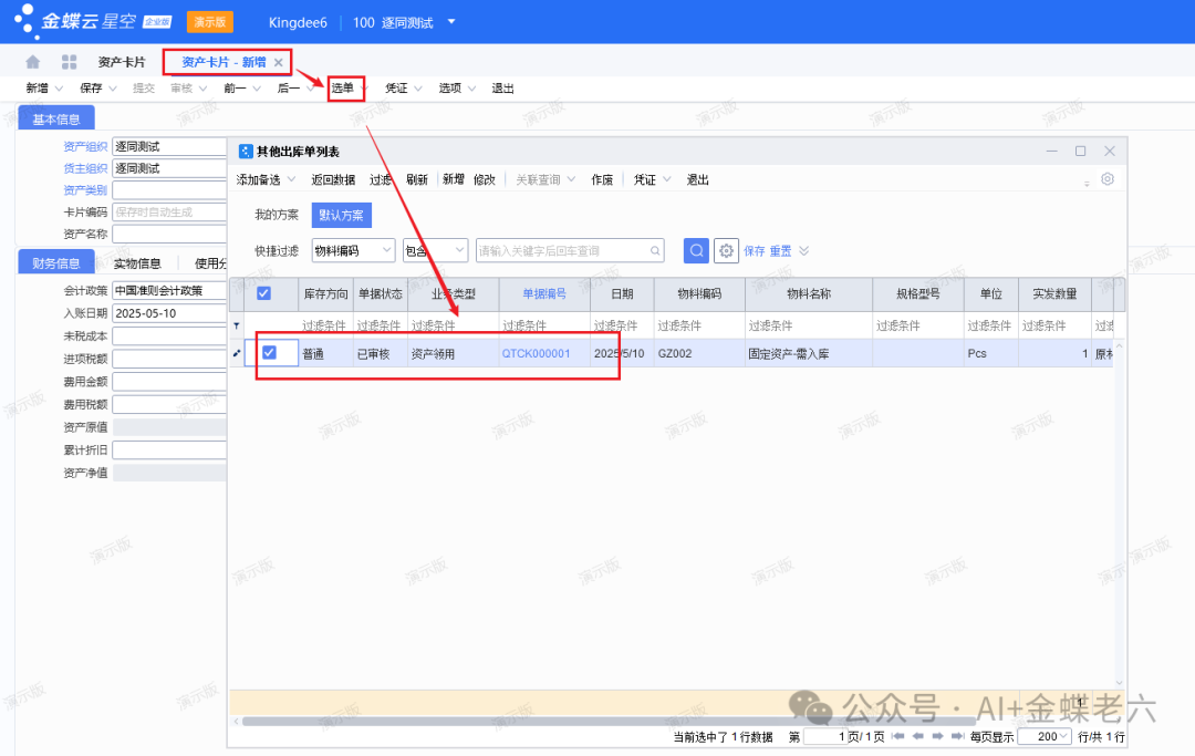 在【資產(chǎn)卡片】中新增卡片→選擇資產(chǎn)類別→點(diǎn)擊【選單】→選擇【其他出庫(kù)單】→關(guān)聯(lián)其他出庫(kù)單→填寫信息→保存審核,如下圖單所示。