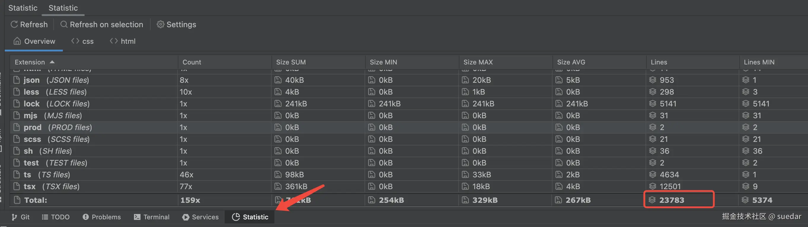 點擊statistics,在這里可以查看到項目代碼的總行數。