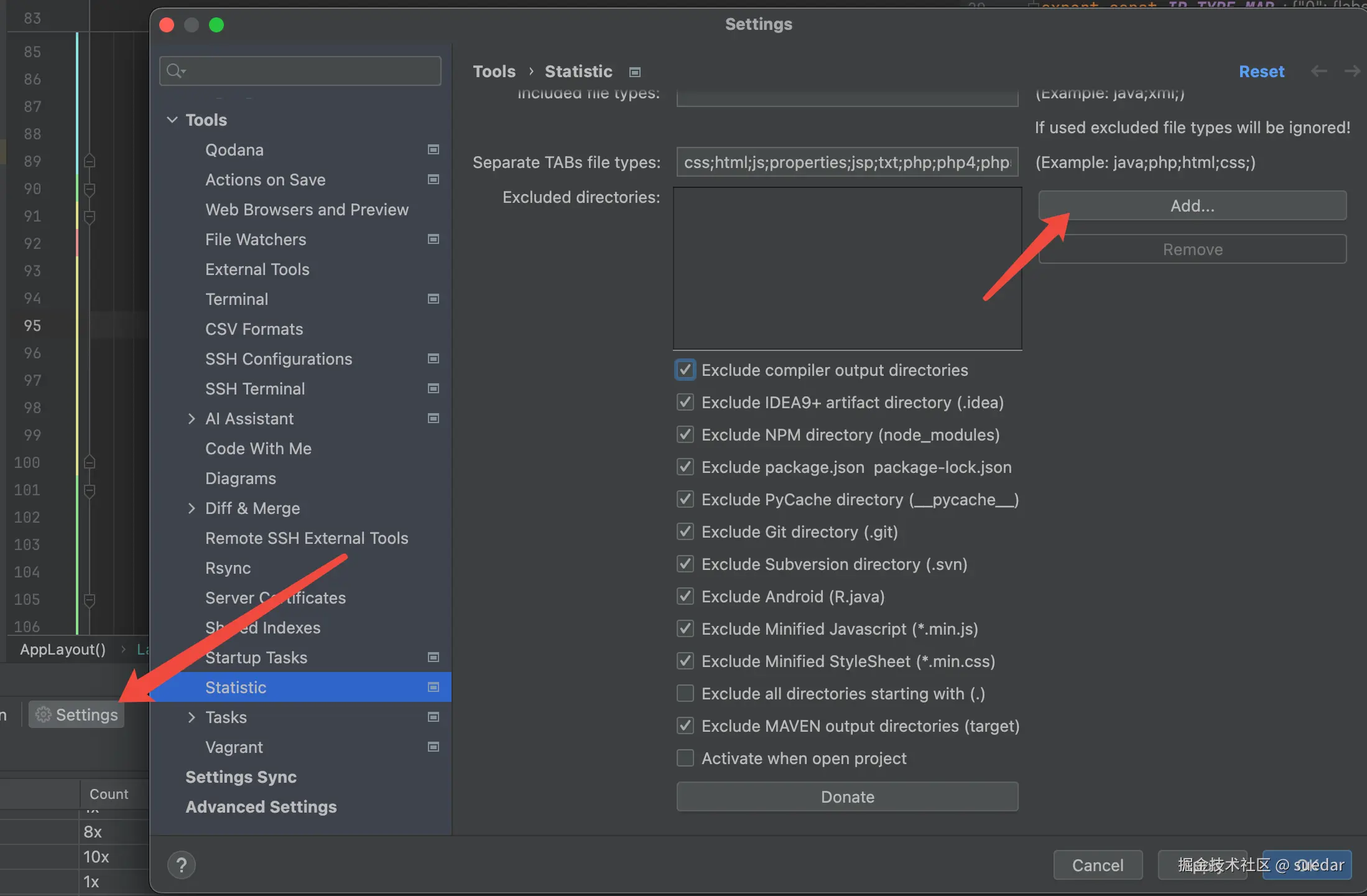 如果需要去掉某些目錄,點擊setting后可以點擊這里的Add,添加后將不會進行統(tǒng)計。