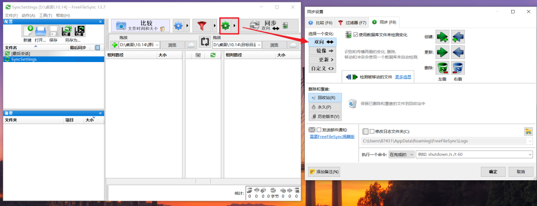 這樣一次簡(jiǎn)單的文件備份就完成了。 可能有小伙伴已經(jīng)發(fā)現(xiàn)了,剛剛在我們同步時(shí)軟件顯示的是雙向。 而這就是 FFS 的一個(gè)特殊之處。 軟件一共為咱們提供了四種同步的方式 ?? 雙向同步(默認(rèn)):識(shí)別左右兩個(gè)目錄中文件的異同,同步后雙方文件及結(jié)構(gòu)保持相同 鏡像同步:無(wú)論目標(biāo)目錄如何改變,最后同步都會(huì)依據(jù)源目錄為準(zhǔn),即「全量備份」 更新同步:即只同步新的文件或是已經(jīng)變動(dòng)的文件,相較于全量備份而言屬于「增量備份」 自定義同步:根據(jù)用戶自定義同步行為進(jìn)行文件同步 這四種同步方式都可以在軟件的綠色齒輪中選擇。