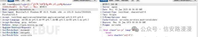 隱式授權類型要簡單得多??蛻舳藨贸绦驘o需先獲取授權碼,然后再將其換成訪問令牌,而是在用戶同意后立即收到訪問令牌。 您可能想知道為什么客戶端應用程序并不總是使用隱式授權類型。答案相對簡單 - 它的安全性要低得多。使用隱式授權類型時,所有通信都通過瀏覽器重定向進行 - 沒有像授權代碼流中那樣的安全反向通道。這意味著敏感的訪問令牌和用戶數(shù)據(jù)更容易受到潛在攻擊。 OAuth 2.0的安全性考慮1)重定向URI的安全性重定向URI是客戶端接收授權碼和訪問令牌的地址。為了防止攻擊者攔截這些敏感信息,重定向URI應該使用HTTPS協(xié)議。此外,授權服務器應該只接受預先注冊的重定向URI,以防止攻擊者將用戶重定向到惡意網站。 2)訪問令牌的保護訪問令牌是一個敏感的憑證,如果被攻擊者獲取,他們就可以訪問用戶的資源。因此,訪問令牌應該在所有傳輸過程中使用HTTPS協(xié)議進行加密,防止被竊聽。在存儲訪問令牌時,也應該使用適當?shù)募用艽胧┻M行保護。 3)刷新令牌的使用和保護刷新令牌通常有較長的有效期,甚至可以設置為永不過期。因此,如果刷新令牌被攻擊者獲取,他們就可以持續(xù)訪問用戶的資源。為了防止這種情況,刷新令牌應該只在后端服務中使用,不應該暴露給前端應用。此外,刷新令牌也應該在所有傳輸和存儲過程中進行加密保護。 4)CSRF攻擊和防范CSRF(跨站請求偽造)是一種常見的網絡攻擊,攻擊者通過偽造用戶的請求來執(zhí)行未經授權的操作。為了防止CSRF攻擊,OAuth 2.0的授權請求可以包含一個state參數(shù),這是一個隨機生成的字符串,用于在授權服務器重定向回客戶端時驗證請求的合法性。客戶端在發(fā)送授權請求時生成state參數(shù),并在接收授權響應時驗證它,如果不匹配,就拒絕響應。 OAuth常見漏洞上面介紹了OAuth常見的一些模式,下面我們來分析一下,OAuth可能存在的問題。 1)CSRF攻擊該攻擊一般出現(xiàn)的場景一般在登陸以后綁定微信的情況下。應用提供了用戶賬號和微信賬號做綁定的功能,也就是說用戶先用自己的賬號登錄,然后可以綁定微信賬號,以便后續(xù)可以使用微信賬號來登錄。 場景一:攻擊者首先通過自己的微信號獲取授權碼 code,然后偽造一個鏈接誘導受害者登錄以后點擊,那么受害者的賬號就會與攻擊者的微信號進行綁定,從而可以登錄受害者的賬號。