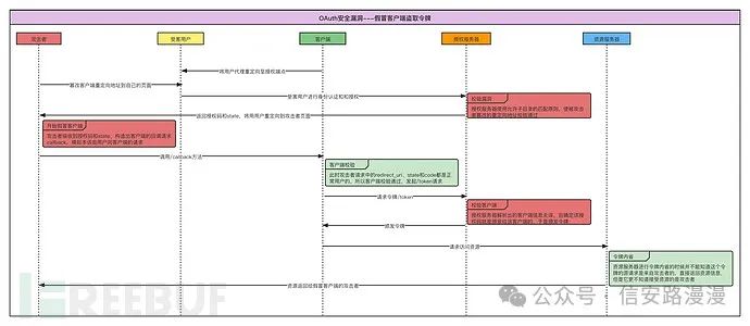 攻擊者只要想辦法實現(xiàn)上面兩點,就能輕松獲取令牌了。為了實現(xiàn)這一點,攻擊者攔截用戶授權請求,并將客戶端重定向uri指向自己的頁面,用戶完成身份認證和授權,如果授權服務器使用寬松的redirect_uri校驗,則會驗證通過生成一個授權碼,然后帶著授權碼和state信息重定向到攻擊者頁面,攻擊者拿到授權碼code和state后會偽造用戶向客戶端的請求(調用客戶端重定向地址),因為state和code都是受害用戶請求的,所以客戶端驗證通過并向授權服務器請求令牌,授權服務器接收到的請求會被認為是正常請求,校驗通過頒發(fā)token,客戶端獲取到token繼續(xù)請求受保護資源,資源服務器將返回請求資源,但是接收資源的人不是正常用戶,而是攻擊者!下面看一下這種攻擊的實現(xiàn)流程: