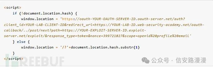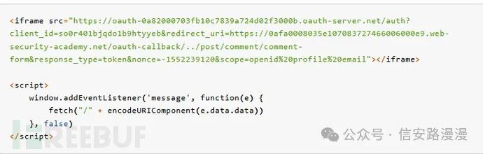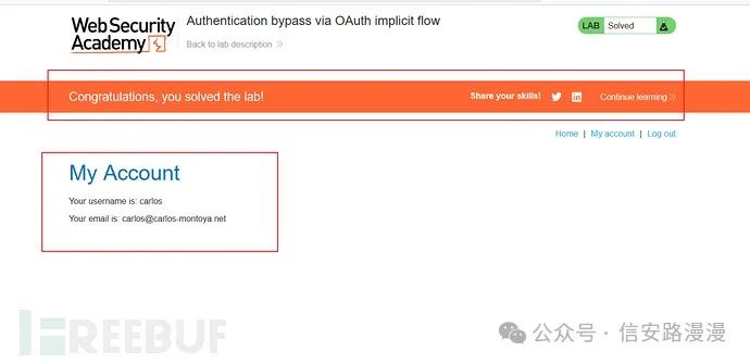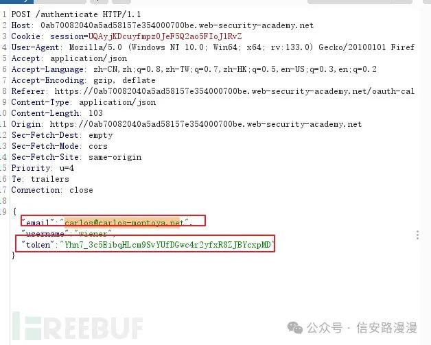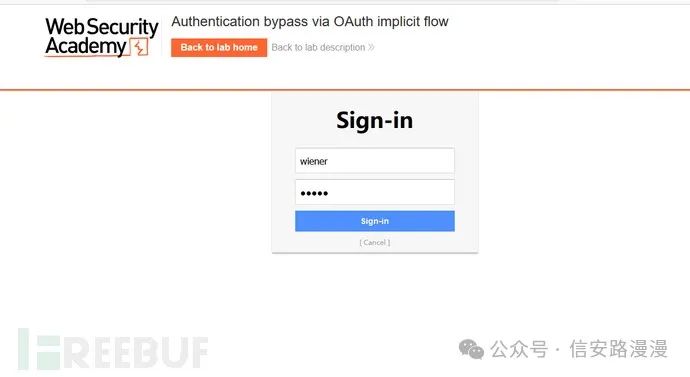 5)登錄流程設計缺陷登錄流程如果存在設計缺陷也可能會導致接管其它人的賬號。如掃描登錄時無需人員確認,那么就可以將二維碼發(fā)送給其他人誘導點擊。 portswigger案例OAuth 隱式流程繞過身份驗證 https://portswigger.net/web-security/oauth/lab-oauth-authentication-bypass-via-oauth-implicit-flow 使用給的用戶名和密碼登錄 username=wiener&password=peter