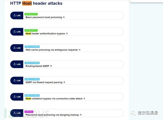 HTTP頭攻擊HTTP Host 頭攻擊會(huì)利用以不安全的方式處理 Host 頭的漏洞網(wǎng)站。如果服務(wù)器隱式信任 Host 標(biāo)頭,且未能正確驗(yàn)證或轉(zhuǎn)義它,則攻擊者可能會(huì)使用此輸入來注入有害的有效負(fù)載,以操縱服務(wù)器端的行為。將有害負(fù)載直接注入到 Host 頭的攻擊通常稱為 "Host header injection"(主機(jī)頭注入攻擊)。 上面我們已經(jīng)了解到就算改變了HTTP報(bào)頭也是可以正常訪問到應(yīng)用的,那么如果后端使用HTTP報(bào)頭,并且沒有做過濾,那么就有可能造成危害。 HTTP報(bào)頭可能得攻擊場(chǎng)景HTTP報(bào)頭攻擊可能存在以下的利用場(chǎng)景 1)重置密碼或者注冊(cè)用戶登場(chǎng)景發(fā)送重置鏈接取HTTP報(bào)頭的值 2)根據(jù)host頭限制一些資源的訪問 3)系統(tǒng)啟用了web緩存功能,可以利用web緩存投毒 4)根據(jù)host頭進(jìn)行路由(基于路由的SSRF) 在portswigger上有關(guān)于http host攻擊的專題,如下: 鏈接:https://portswigger.net/web-security/all-labs#http-request-smuggling