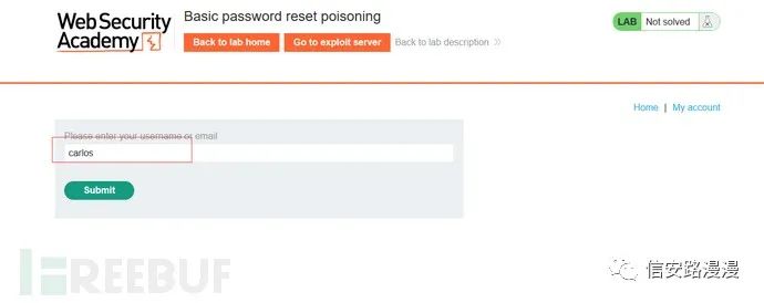 在真正的攻擊中,攻擊者可能會(huì)偽造一個(gè)假的警告通知來提高受害者點(diǎn)擊鏈接的概率。 即使不能控制密碼重置的鏈接,有時(shí)也可以使用 Host 頭將 HTML 注入到敏感的電子郵件中。請(qǐng)注意,電子郵件客戶端通常不執(zhí)行 JavaScript ,但其他 HTML 注入技術(shù)如懸掛標(biāo)記攻擊可能仍然適用。 PortSwigger靶場(chǎng)測(cè)試 在這里添加用戶名,然后攔截?cái)?shù)據(jù)包,將數(shù)據(jù)包改成你的exploit server。