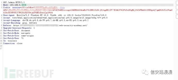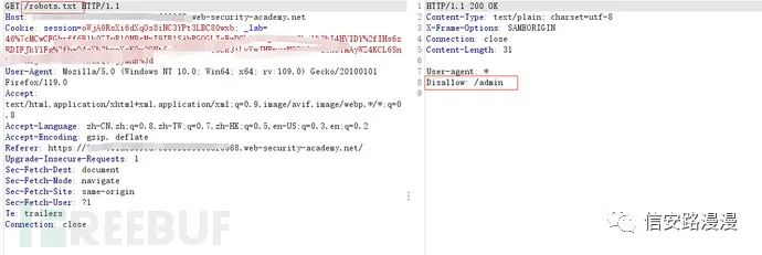 根據(jù)host限制資源的訪問有時(shí)處于安全的考慮,會(huì)把某些功能限制成只能特定的IP或者h(yuǎn)ost頭訪問,那么通過修改host頭就可能繞過這個(gè)限制。 portswigger靶場(chǎng):https://portswigger.net/web-security/host-header/exploiting/lab-host-header-authentication-bypass 訪問robots.txt發(fā)現(xiàn)存在admin頁(yè)面,直接訪問顯示拒絕