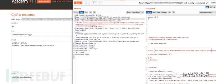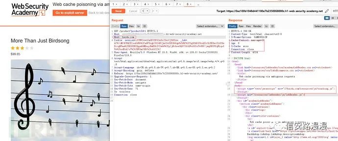 下面結(jié)合portswigger上的實(shí)驗(yàn)來看一下 鏈接:https://portswigger.net/web-security/host-header/exploiting/lab-host-header-web-cache-poisoning-via-ambiguous-requests 打開這個(gè)實(shí)驗(yàn),可以看到,添加一個(gè)host頭,會(huì)返回在響應(yīng)中,而且啟用了web緩存功能,那么我們可以將host頭替換成我們服務(wù)上同名的文件:/resources/js/tracking.js