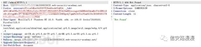 基于host頭進(jìn)行路由有的應(yīng)用會(huì)根據(jù)host頭進(jìn)行路由,那么在這種情況下,我們可以通過改變host頭來訪問內(nèi)網(wǎng)的應(yīng)用,也就是常說的SSRF。 這可能需要知道內(nèi)部系統(tǒng)的IP地址(私有地址),一般可以通過信息收集或者Fuzz來判斷有效的私有IP地址(如枚舉192.168.1.1/16) 接下來還是看一下portswigger上面的實(shí)驗(yàn) 鏈接:https://portswigger.net/web-security/host-header/exploiting/lab-host-header-routing-based-ssrf 該實(shí)驗(yàn)已知內(nèi)網(wǎng)中存在admin頁(yè)面并且通過host頭進(jìn)行路由 直接訪問顯示404