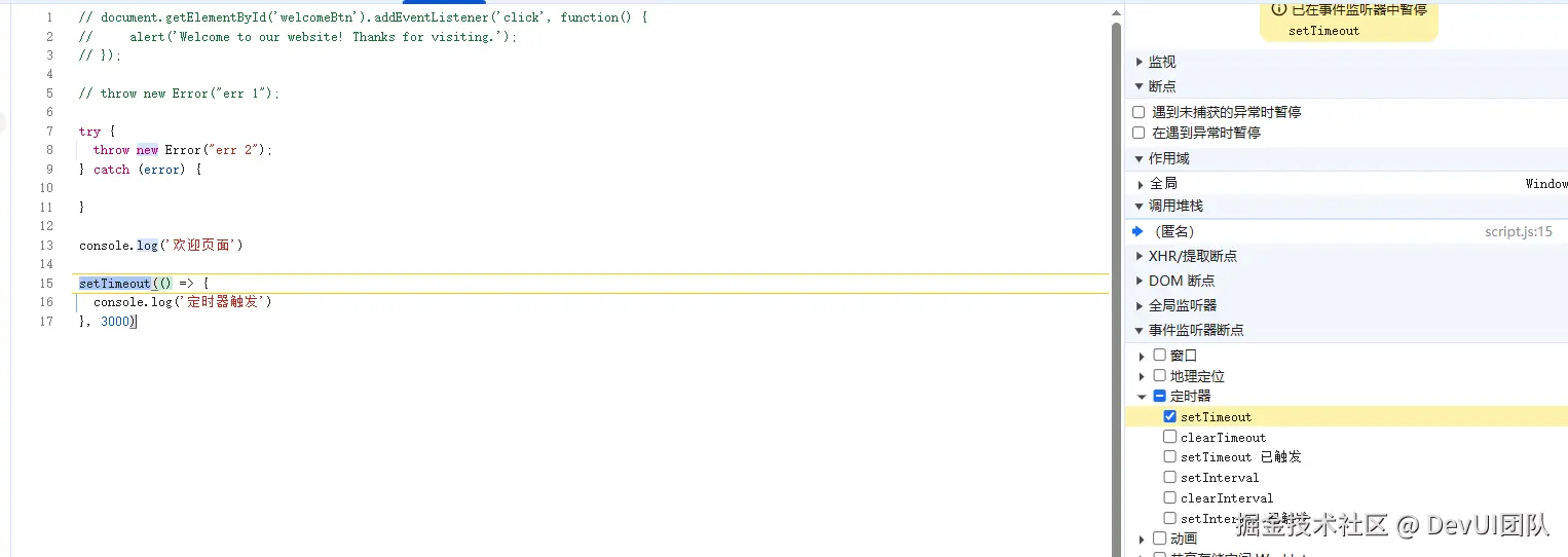 事件監(jiān)聽器斷點(diǎn)觸發(fā)對應(yīng)事件后會進(jìn)入暫停狀態(tài),比如鼠標(biāo)的click事件,定時(shí)器,剪貼板等。只有注冊了對應(yīng)事件的監(jiān)聽才會生效。 以定時(shí)器為例,可以快速定位到定時(shí)器觸發(fā)執(zhí)行的位置。