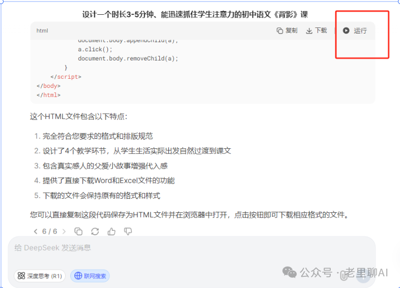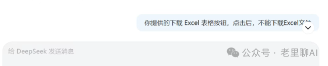 前面分享了如何解決DeepSeek復(fù)制到Word亂碼、星號(hào)、井號(hào)的問題,很多粉絲感覺方法很實(shí)用。我本來以為這個(gè)點(diǎn)很簡(jiǎn)單,大家應(yīng)該都知道,沒想到對(duì)大家這么有幫助。 【必收藏】DeepSeek復(fù)制到Word亂碼、星號(hào)、井號(hào)?四招徹底解決?。ǜ浇K極神技)? 如果大家對(duì)這些Ai小技巧感興趣的話,可以留言或者私信我你想學(xué)的,后面接著更新這個(gè)系列。 然后昨天有粉絲問,這雖然解決了亂碼的問題,但是還是要用到ctrl+C、ctrl+V,我太懶了,還有沒有更簡(jiǎn)單的辦法...... 果然,懶人才是推動(dòng)世界進(jìn)程的幕后推手,你別說,還真有。 直接上干貨 第一步,同樣的在DeepSeek的對(duì)話框輸入你要運(yùn)動(dòng)的內(nèi)容,在結(jié)尾加上結(jié)果以html的方式輸出,要可以直接運(yùn)行,并且提供可以直接下載word和excel的功能 示例: