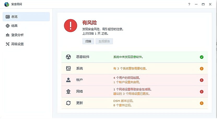 介紹:如何讓群暉NAS更安全呢,這里整理了一些安全方面的設置,大家可以進行參考。 以DSM7.2.2系統(tǒng)版本為例。 ▼啟用安全顧問 安全顧問是群暉DSM系統(tǒng)中內(nèi)置的應用程序,可以對您的群暉NAS進行場景選擇后的掃描,掃描后的風險選項可提供如何解決建議。