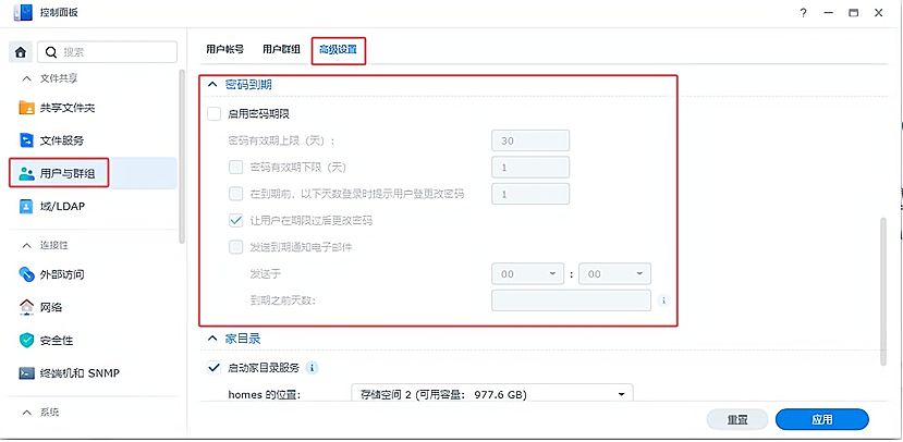 ▼設置密碼到期 您可以強制用戶在一段時間后更改密碼。在以下位置選擇啟用密碼到期: 前往控制面板 > 用戶和群組 > 高級 > 密碼到期。