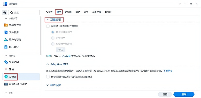 ▼使用帳戶雙重驗證 雙重驗證為您的 DSM 帳戶提供額外的安全性??蓮娭茊⒂?,也可以對賬戶自定義啟用。 強制啟用可以設置所有用戶或指定用戶群組,登錄DSM前往控制面板>安全性>帳戶 > 雙重驗證。