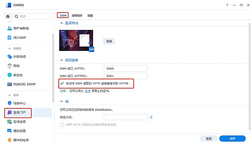 ▼使用加密連接 要使用 SSL/TLS 加密連接,請使用 HTTPS 訪問 DSM 和基于 Web 的套件,如 Synology Chat、Synology Drive、Synology Photos 和 Surveillance Station。這可以保護客戶端與您的 Synology NAS 的通信。 您可以使用以下方法啟用 HTTPS: DSM 登錄使用HTTPS協(xié)議,控制面板 > 登錄門戶 > DSM 以選擇自動將 HTTP 連接重定向到 HTTPS 。