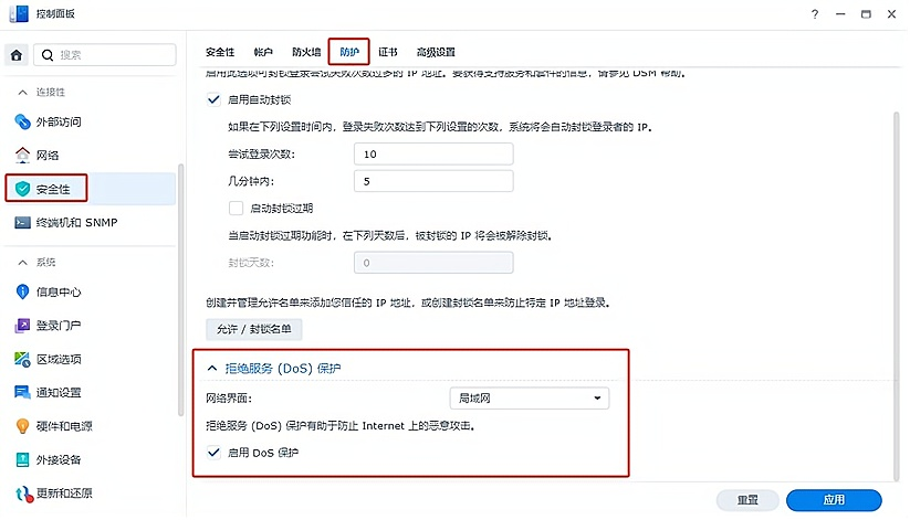 對于移動端應用程序和實用程序登錄,請在 Synology 移動應用程序或桌面實用程序的登錄屏幕上選擇 HTTPS。 完成上述設置后,請確保添加有效的 SSL 證書。 此外,由于某些服務或軟件包也提供連接加密,您可以嘗試以下方法來提高 Synology NAS 的安全性: ?啟用 FTPS 或 SFTP 代替 FTP,因為 FTP 不提供加密來保護數(shù)據(jù)傳輸。 ?通過 Hyper Backup 將數(shù)據(jù)備份到遠程目的地時,選擇傳輸加密。 ?使用 共享文件夾同步時,選擇啟用 SSH 傳輸加密。 Synology NAS 可以通過互聯(lián)網(wǎng)輕松訪問。為了確保您的 Synology NAS 的安全,建議僅為路由器上所需的服務打開公共端口。群暉所用端口請參考前文介紹。 ▼啟用 DoS 保護 您可以啟用拒絕服務 (DoS) 保護以防止網(wǎng)絡上的惡意攻擊。為此,請轉到控制面板 > 安全性 > 保護,選擇啟用 DoS 保護,然后單擊應用。 啟用后,您的 Synology NAS 將根據(jù) DSM 版本做出不同響應:對于 DSM 7.0 及以上版本:NAS 將響應每秒最多 1,000 個 ICMP ping 包。如果頻率超過每秒 1,000 個 ping,NAS 將停止響應額外的請求。