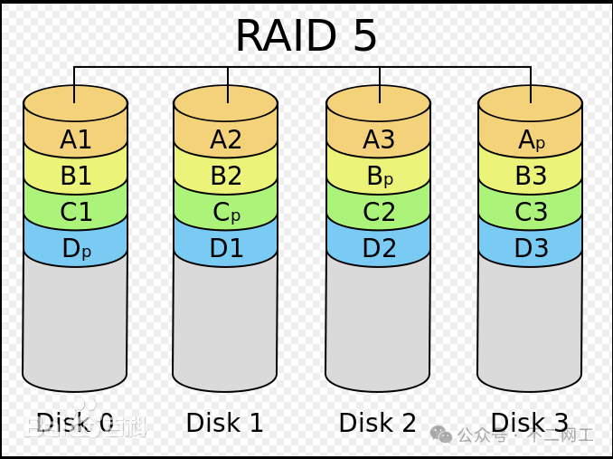 Raid 5:至少需要3塊硬盤,一塊磁盤冗余。它是最通行的配置方式。具有奇偶校驗(yàn)的數(shù)據(jù)恢復(fù)功能的數(shù)據(jù)存貯方式。奇偶校驗(yàn)數(shù)據(jù)塊分布于陣列里的各個(gè)硬盤中。